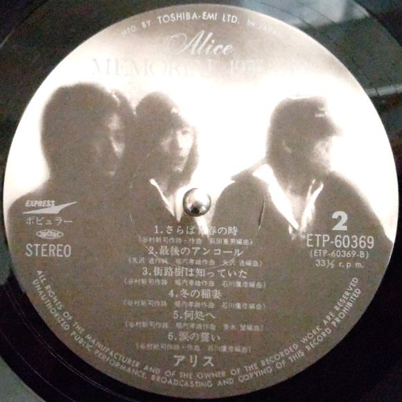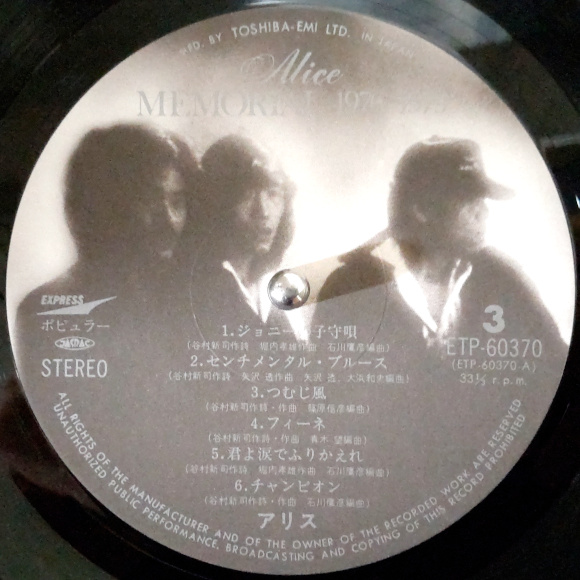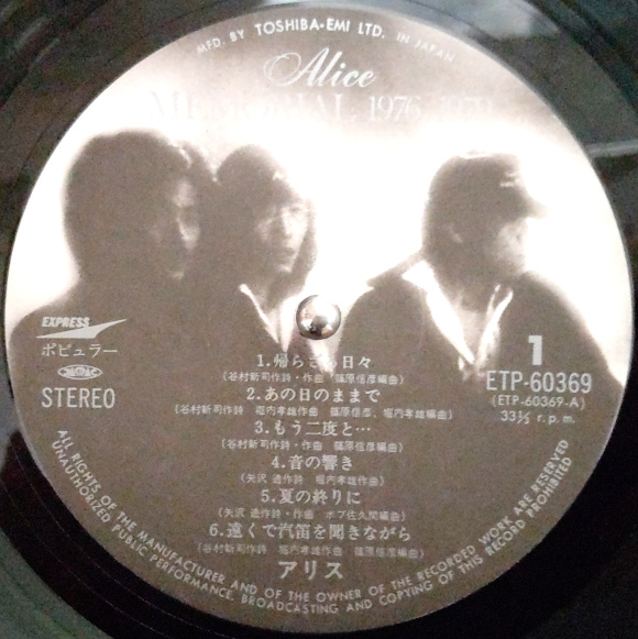 1枚目、A面1曲目「帰らざる日々」、Bye Bye・・・、懐かしい。谷村さんのボーカルも素敵です。サビのメロディが私の心にしみついています。A面6曲目「遠くで汽笛を聞きながら」、昨年、堀内さんが出られてた番組で、アリスの光が見えた曲だったと言われてた記憶があります。B面4曲目「冬の稲妻」、これですよ、アリスサウンド。堀内さんのサウンドに納得。大ヒットグループへ一気に登り始める曲。You're rollin' thunder ・・・ あっ、とても懐かしい。B面6曲目「涙の誓い」、私の好きな曲のひとつです。最後の最後の祈り・・・。2枚目、A面1曲目「ジョニーの子守唄」、名曲です。このメロディラインが、まさしく70年代後半のサウンド感。今聴いても、気持ちが良いですね。A面6曲目「チャンピオン」、大ヒット曲登場。このベストアルバム最高じゃないですか。これが谷村サウンド。歌詞もいい。目の前に情景が浮かびます。サビのメロディが私たちに勇気を与えてくれます。この時代の曲って、まわりまわって、今必要とされているサウンドじゃないでしょうか。心に響いて、す〜っと、入ってきて、感動を与えてくれる。B面5曲目「終止符」、これも名曲。堀内さん本当にいい曲を書かれます。柔らかいサウンドに心癒されます。アリスの一番良い時期を集めたベスト盤でした。40年以上も前のレコードから再生されるサウンドは本当に生きてます。目の前で音楽が踊っています。これがアナログレコードの魅力。 | |