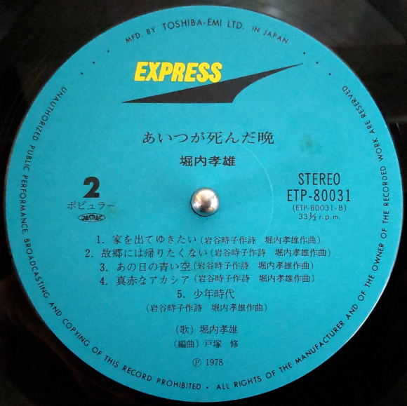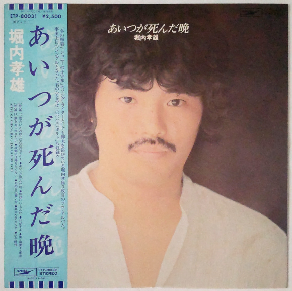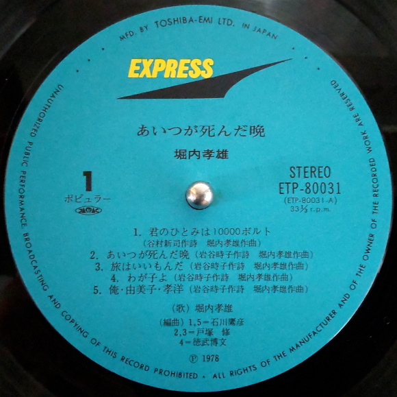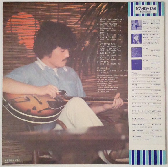 A面1曲目「君のひとみは10000ボルト」、そうか、もうそんなに前の歌なんですね。CMソングにも使われていた記憶があります。アリスだけではなく、ソロで歌う堀内さんも素敵です。サビの部分は忘れられません。それにしてもアナログレコードから聞こえてくる間奏のエレキギターの音がとっても美しい。もちろんメロディも歌詞もボーカルも好きです。A面2曲目「あいつが死んだ晩」、アルバムタイトル曲です。明るい曲の次に何故か暗いタイトルの曲。でもとても素敵な歌詞に堀内さんの歌声が響きます。しっとりと歌い込まれています。A面4曲目「わが子よ」、我が子に向けた勇気づけソング。と同時に親としての自分に向けた宣言でもあります。B面2曲目「故郷には帰りたくない」、曲のタイトルを見て、何故にそうなん?と思いましたが、都会で強がっているある男の心情を歌っているのです。どの曲も堀内さんのボーカルはとても綺麗です。B面3曲目「あの日の青い空」、これは明るい歌でしょう。曲の入り方からして。伸びやかなボーカルが良いですね。でも歌詞は意味深でした。とても深い歌なんですね。考える〜。子供・家族・人生、多分アルバムのコンセプトではあると思いますが、シングル曲を除くと全体的に重たい歌が多いです。そんな時代だったのかも。まあメロディはそれほど暗くはありません。その当時をそのまま再現してくれるアナログレコードは本当に素晴らしい。 | |
