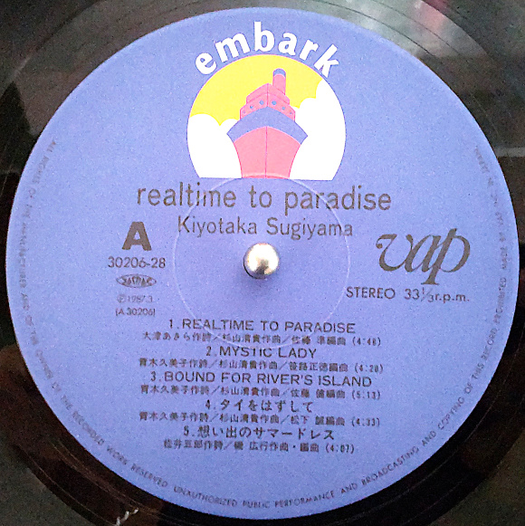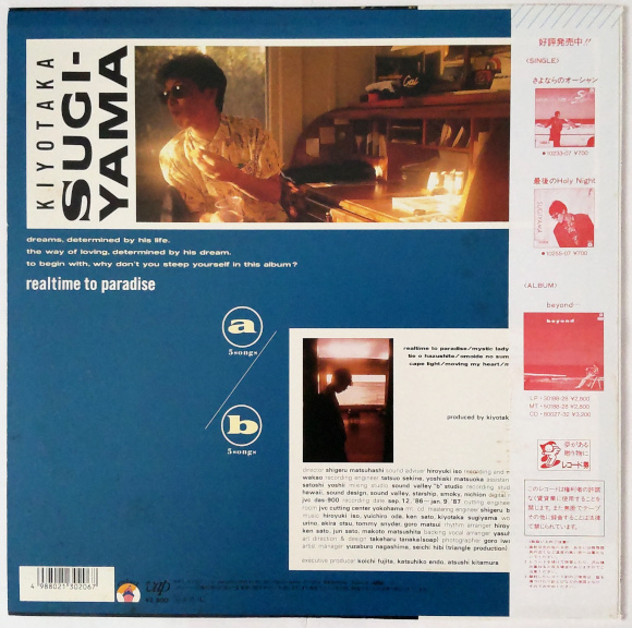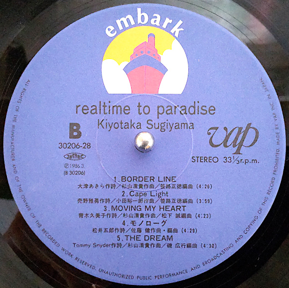 A面1曲目「REALTIME TO PARADISE」、アルバムタイトル曲です。リアル・タイムっていうサビの部分は当時聴いてました。杉山清貴サウンドは夏にピッタリです。A面2曲目「MYSTIC LADY」、ミディアムテンポでリズムをドラムがしっかり刻んでくれるので私的には心地良いサウンドです。B面1曲目「BORDER LINE」、イントロから良い曲の予感。これぞ杉山清貴サウンドなりって感じです。とても爽やかな曲調です。間奏のエレキギターも軽快。杉山さんのボーカルも素敵。まさに80年代サウンド感満載。B面3曲目「MOVING MY HEART」、いいですね、疾走感のあるイントロで始まりました。サビの部分のメロディが印象的。よく聴いていると杉山さんの声がとても若い。前向きな気持ちに、明るくなる曲です。これがアナログレコードのポテンシャルなのか、低音が素晴らしい。改めて感動。ジャケットにはデジタルマスタリングと記載されているのでマスター音源はCD音源と同じと考えますがアナログレコードを通して聞こえる音はCDとは違います。とてもリアルです。毎回言ってますがアナログレコードは不滅です。 | |
