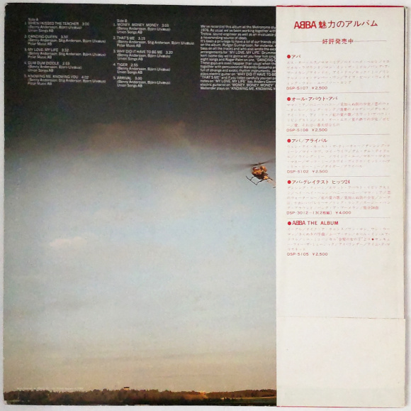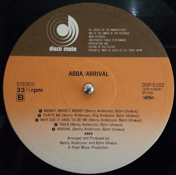 A面2曲目「DANCING QUEEN」、名曲ダンシング・クイーンです。今聴くととても懐かしい。スケール感がとても大きいサウンドです。アバの代表曲のひとつです。A面4曲目「DUM DUM DIDDLE」、ちょっとポップなサウンド。でも初めて聴く感じ。サビのDUM DUM DIDDLEがクセになりそうです。B面1曲目「MONY,MONY,MONY」、これも名曲。低いメロディから入る感じがとても好きです。曲のほとんどがサビ的な感じ。クセになるメロディライン。素敵です。B面3曲目「WHY DID IT HAVE TO BE ME」、これはちょっとカントリー調なサウンドに聞こえます。オリジナルアルバムだけに、何か初めて聴く曲が多いです。アナログレコードで発見されるサウンドに会える喜び。B面5曲目「ARRIVAL」、これはインストです。アルバムタイトル曲になってます。雄大な自然が目の前に見えてくる感じでしょうか。メロディラインが東洋風に聞こえるような気がします。とても良かったです。 | |