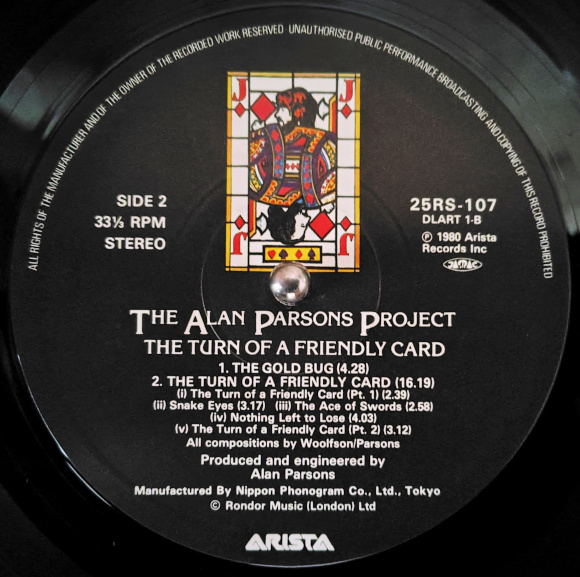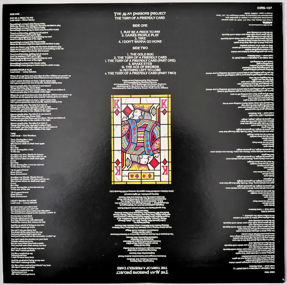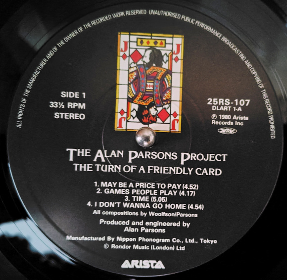 | A面1曲目「MAY BE A PRICE TO PAY」、ボーカルの声質が異なっているので、私の知っているアランパーソンズとはちょっと変わって聞こえます。少しロック調が強い感じ。でも流れるような美しいメロディラインは健在。A面3曲目「TIME」、一転してスローバラード調。そうそうこの声質がアランパーソンズなんです。心地よい優しいボーカルがゆったりと心を癒してくれるサウンドです。B面2曲目「THE TURN OF A FRIENDLY CARD」、16分にも及ぶ組曲です。聴いてみる価値ありです。流れるような美しいメロディラインの曲から、映画の一場面が思い浮かぶような曲、迫力のあるプログレッシブ・ロックなど、圧巻のエンディングを迎えるサウンドになっています。とても勇気をもらえる組曲でした。 | |
